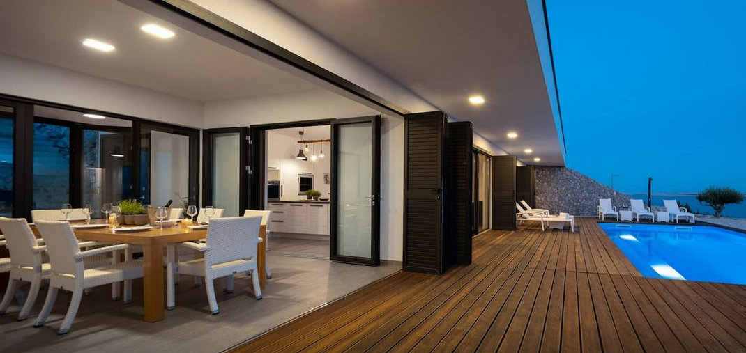 Nenametljivo je uklopljena u okoliš, a od kristalno čistog mora i prve privatne plaže udaljena je svega 100-injak metara. U njenom sklopu nalazi se i grijani bazen s natkrivenom terasom i sunčalištem, igralište za djecu te mjesto za pripremu roštilja.